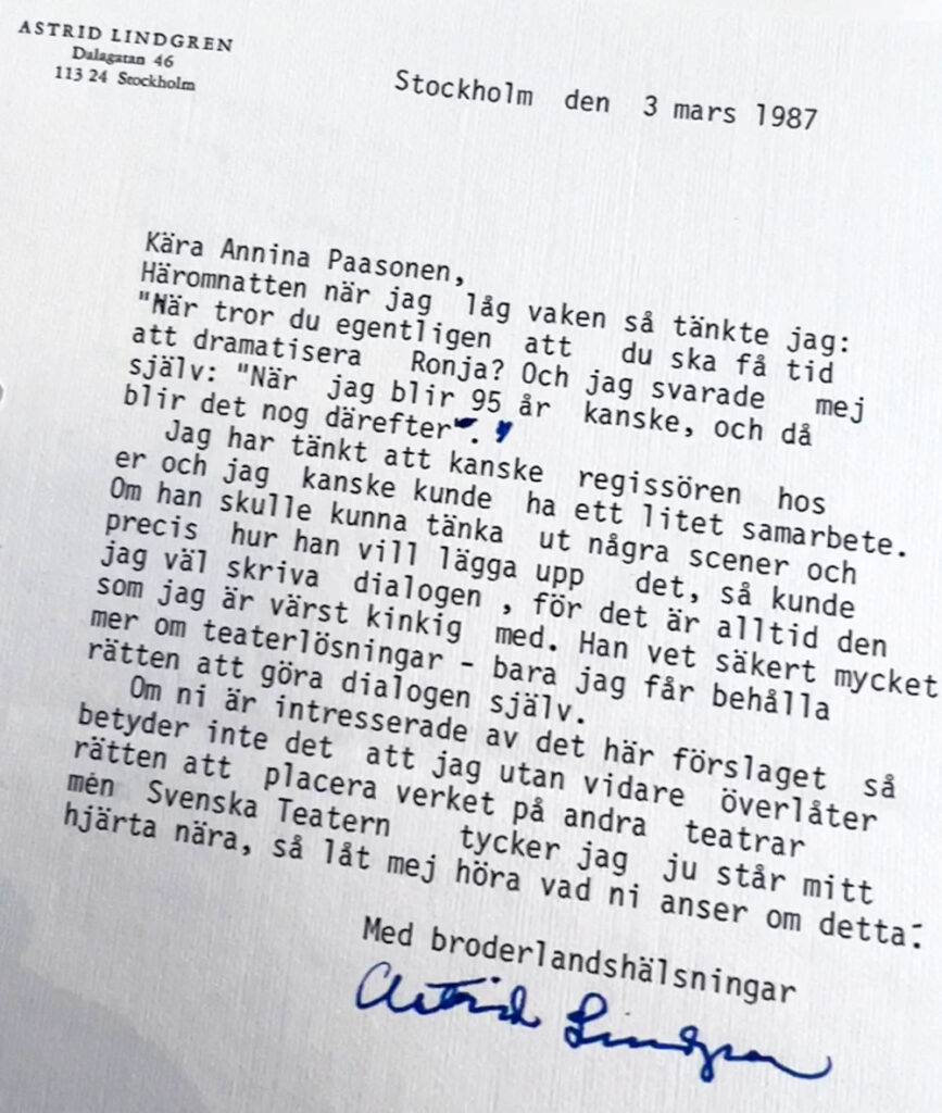 ”Kära Annina Paasonen. Häromnatten när jag låg vaken så tänkte jag: ”När tror du egentligen att du ska få tid att dramatisera Ronja?” Och jag svarade mej själv: ”När jag blir 95 år kanske, och då blir det nog därefter.”