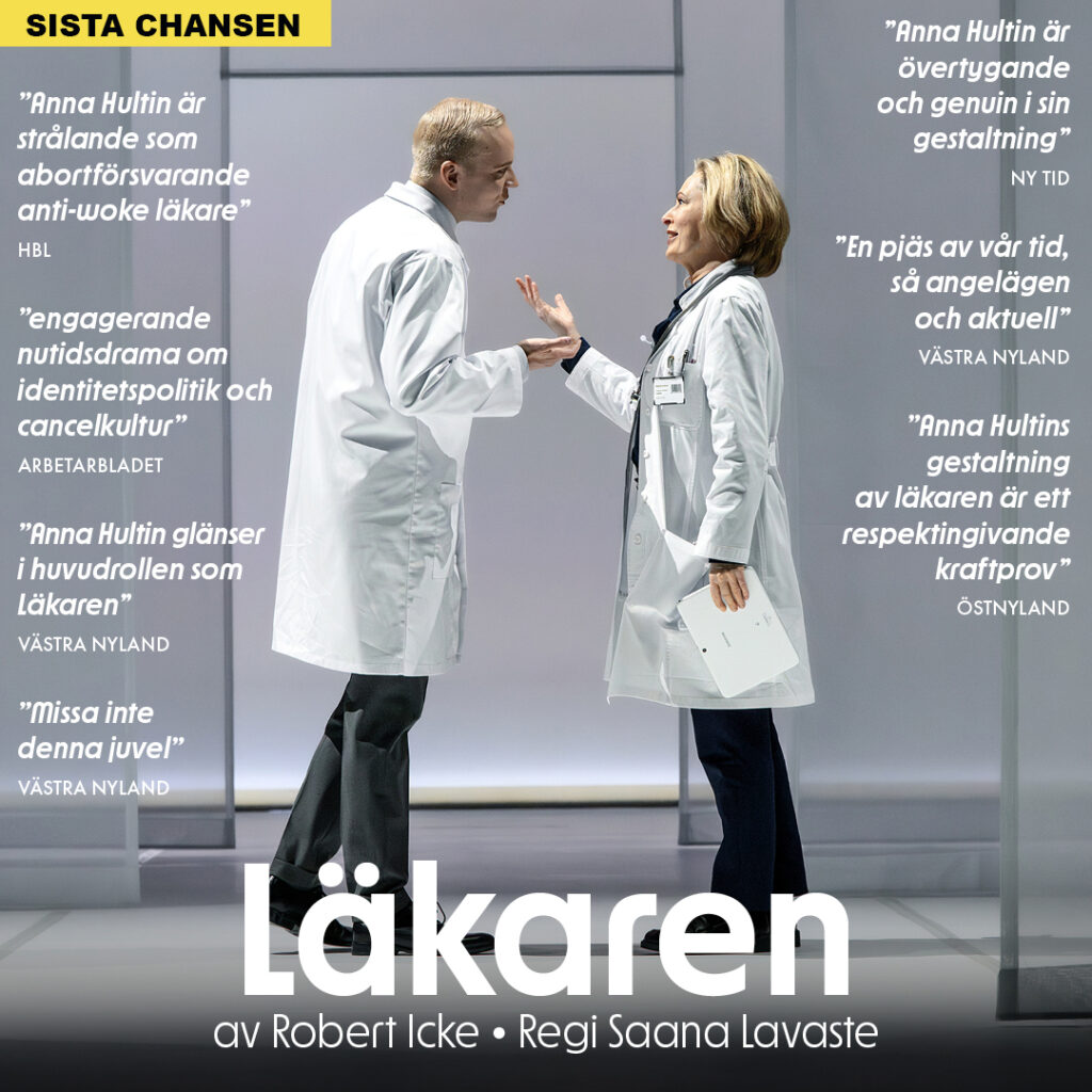 Vårens föreställning Läkaren har hyllats i pressen, framför allt för alla lysande skådespelarprestationer men också för sin aktuella tematik. Som Västra Nyland skrev ”En pjäs av vår tid, så angelägen och aktuell”. Läkaren är en pjäs som helt tydligt väcker diskussion, som engagerar och t.o.m provocerar. En föreställning som i bästa fall utmanar dina egna förutfattade meningar. Vi har sammanställt en sida med utdrag ur recensionsflödet. Lyssna också till Yles finska omdöme via vår direktlänk.