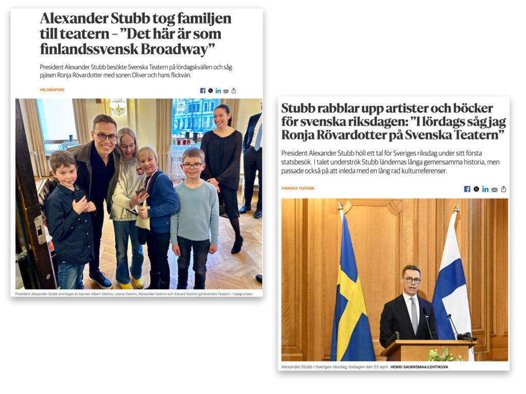– Jag tycker det är fint hur president Alexander Stubb lyfter Astrid Lindgren och hennes betydelse i sitt tal under statsbesöket i Stockholm. Givetvis är vi glada att presidenten nämner Svenska Teatern och vår föreställning av Ronja Rövardotter i sammanhanget, säger Joachim Thibblin.