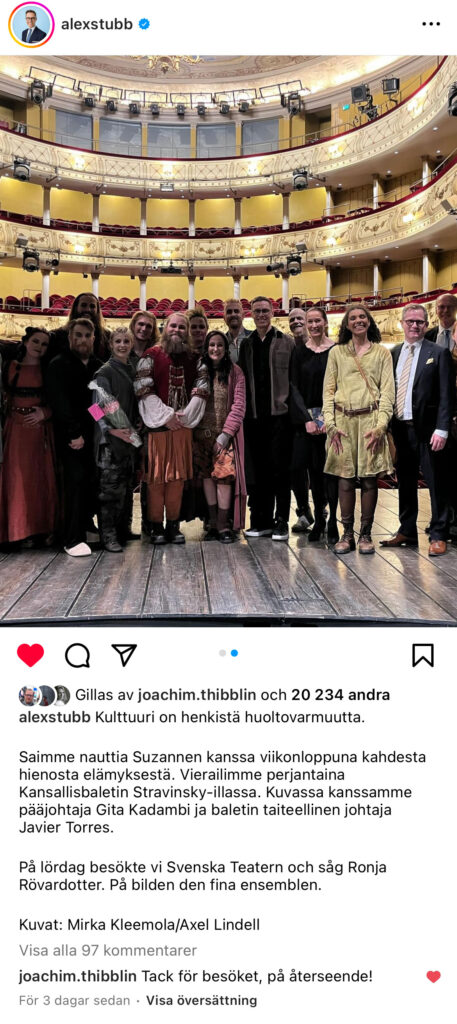 Alexander Stubb publicerade även en bild från teaterbesöket på instagram.